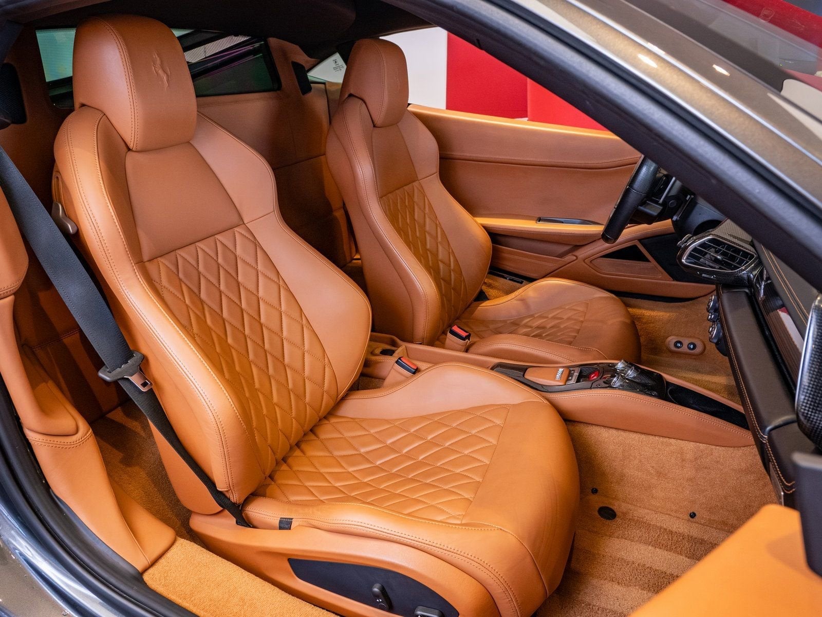 Inside, the Cuoio leather interior provides a warm and inviting contrast to the exterior. Electric seats offer comfort and adjustability for daily use or long drives, while carbon fiber dashboard accents infuse the cabin with lightweight, motorsport-inspired styling. The front suspension lift system adds real-world functionality, allowing the car to confidently navigate driveways and steep inclines.