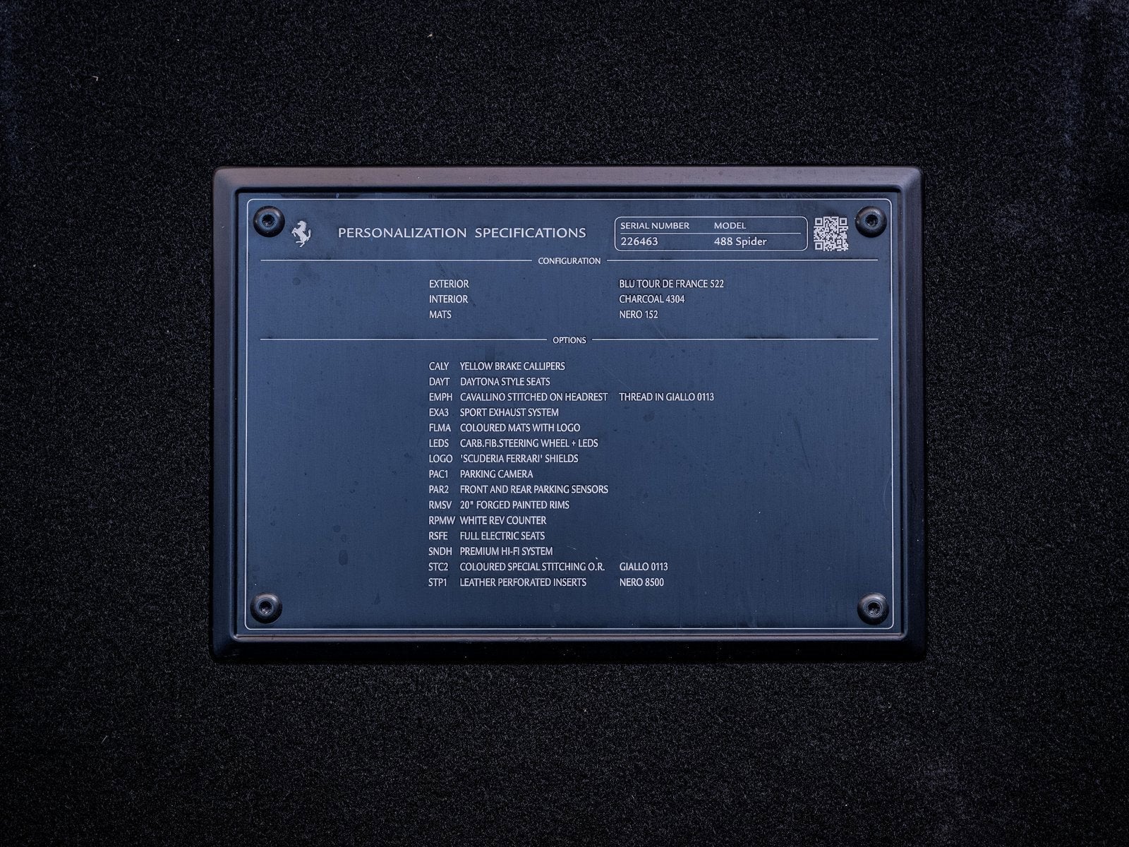 The flowing lines and aerodynamic sculpting of the 488 Spider are enhanced by its purposeful stance and bespoke upgrades. Most notably, this example is equipped with an Akrapovic titanium exhaust with valve controller, delivering an even more pronounced and thrilling soundtrack while reducing weight and elevating performance character.