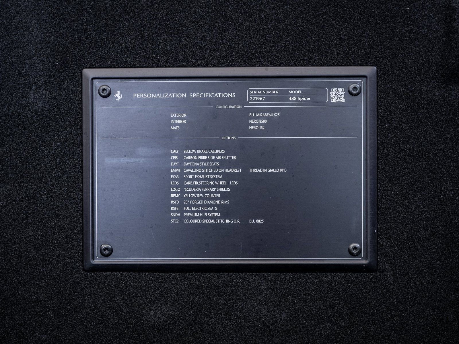 Engine and Performance: Powering the 488 Spider is a 3.9 liter twin turbocharged V8 engine, delivering 661 horsepower and 561 lb ft of torque through a 7 speed dual clutch transmission. With a 0 to 60 mph time of just 3.0 seconds, the 488 Spider offers breathtaking acceleration paired with razor-sharp handling. The mid-engine layout and aerodynamic enhancements ensure this Ferrari feels just as at home on canyon roads as it does cruising the coastline.