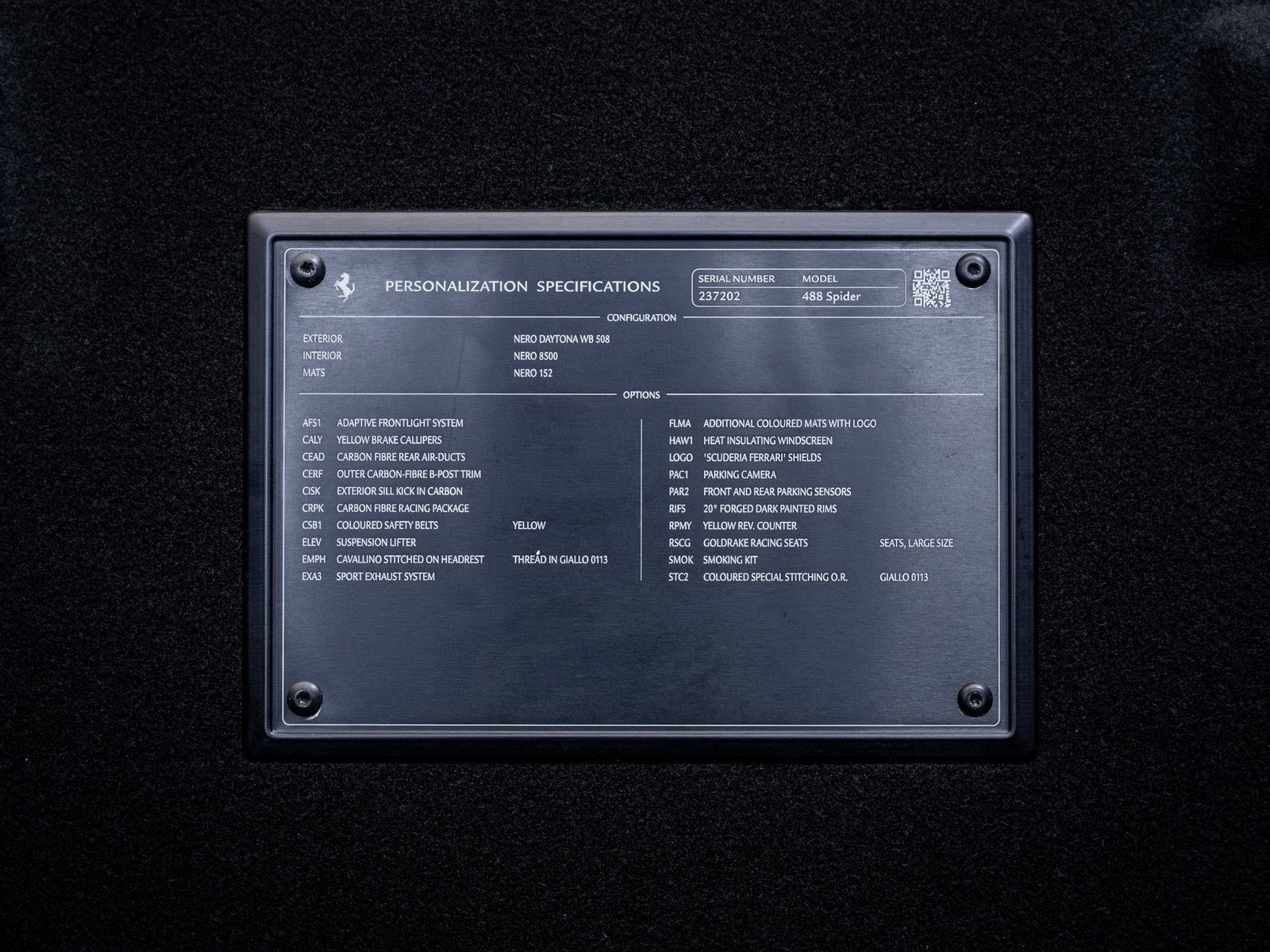 The deep Nero Daytona finish highlights the 488 Spiders sculpted aerodynamic lines, while extensive lightweight enhancements elevate both form and function. This example is equipped with carbon fiber rear air intakes and a racing pack in carbon fiber, reinforcing its motorsport character and enhancing airflow and visual impact. A carbon fiber exterior sill plate further emphasizes the performance focused detailing that defines this configuration.
