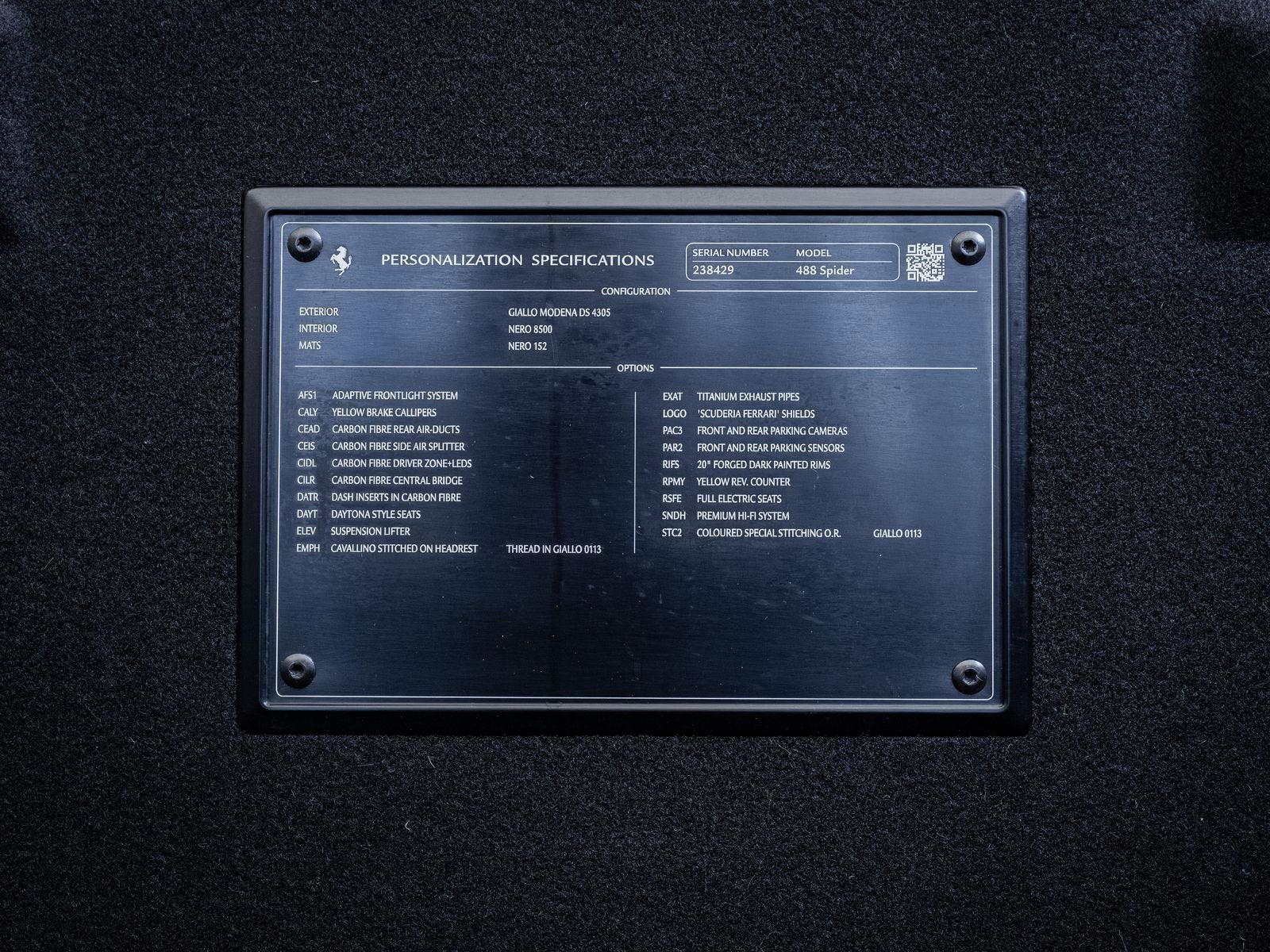 Engine and Performance: Powering the 488 Spider is a 3.9 liter twin turbocharged V8 engine producing 661 horsepower and 561 lb ft of torque. Mated to a 7 speed dual clutch transmission, the car rockets from 0 to 60 mph in just 3.0 seconds. The mid-engine layout delivers balanced handling and extraordinary responsiveness, while the open-air configuration brings an added layer of sensory exhilaration to every drive.