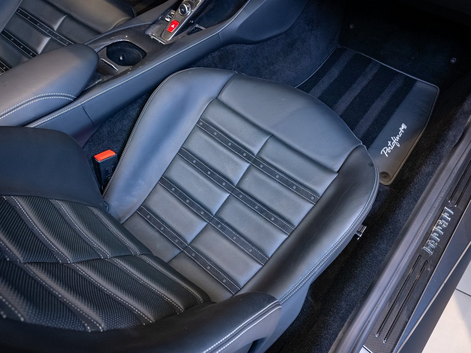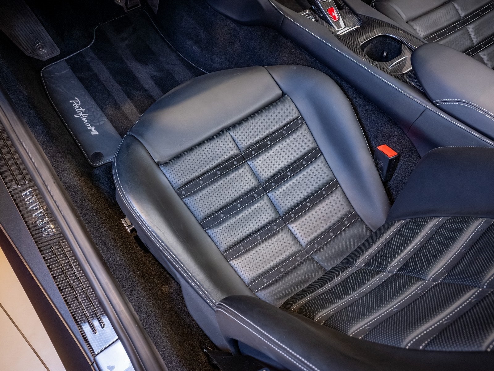 The sleek exterior is complemented by a carbon fiber exterior sill plate, adding a touch of motorsport flair to its elegant proportions. The updated design of the Portofino M gives it a more assertive stance while preserving the flowing lines and grand touring spirit Ferrari is known for.