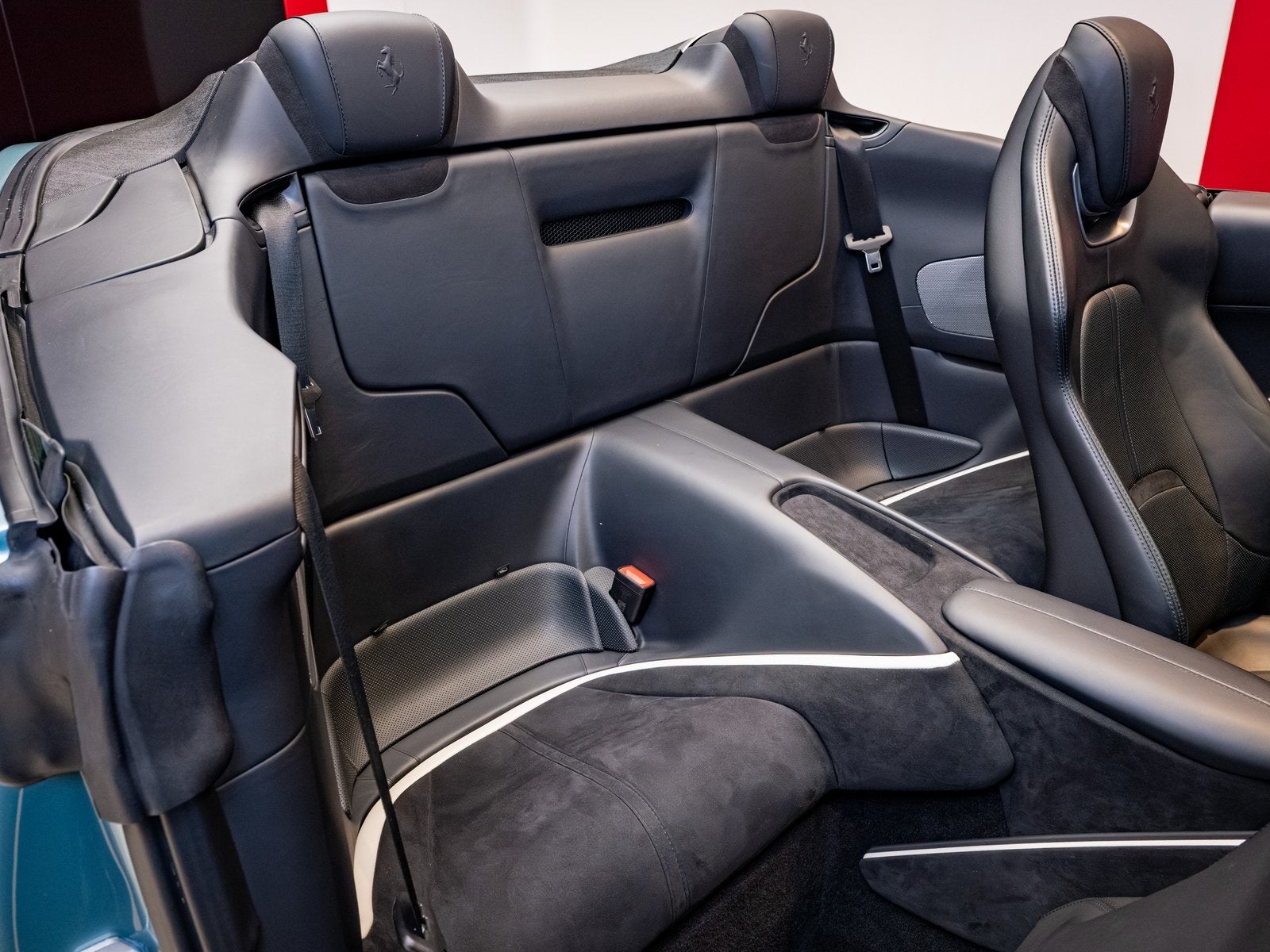 Inside, the cabin is tailored in a sporty yet refined Nero leather and Alcantara interior, offering a perfect balance of texture and contrast. The carbon fiber steering wheel with LEDs provides a driver-focused interface, while the passenger display invites co-pilots into the experience. Full electric ventilated seats ensure year-round comfort, and the added front seat neck warmer makes top-down driving even more enjoyable during cooler days. A premium Hi Fi system rounds out the interior with exceptional sound quality.